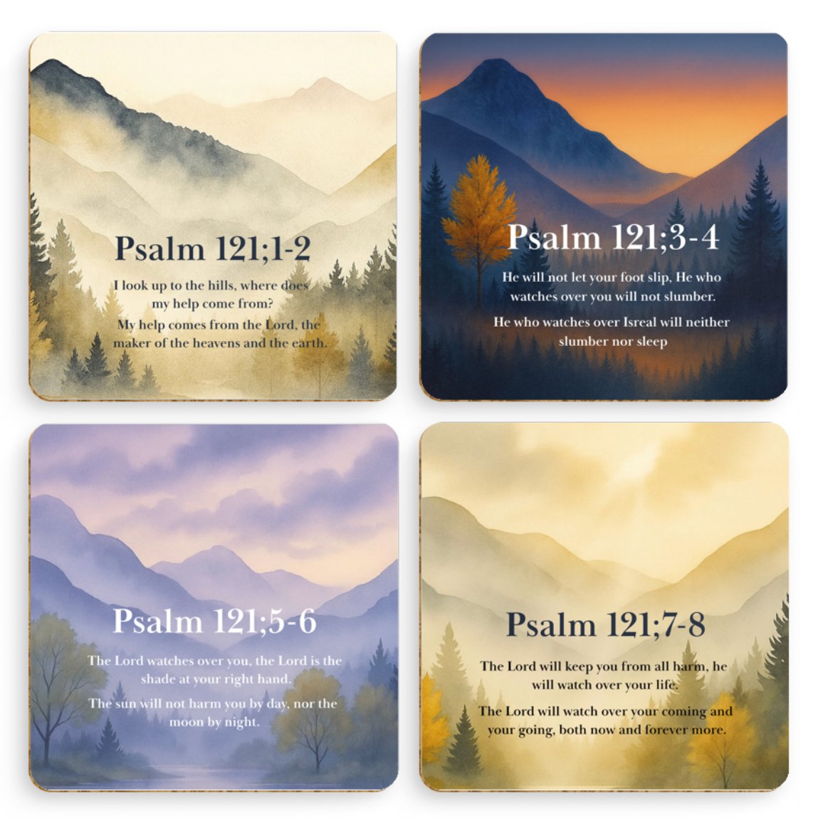 A set of four uniquely designed coasters, featuring Psalm 121 with its majestic mountain theme. Inspiration and peace for any quiet coffee time.